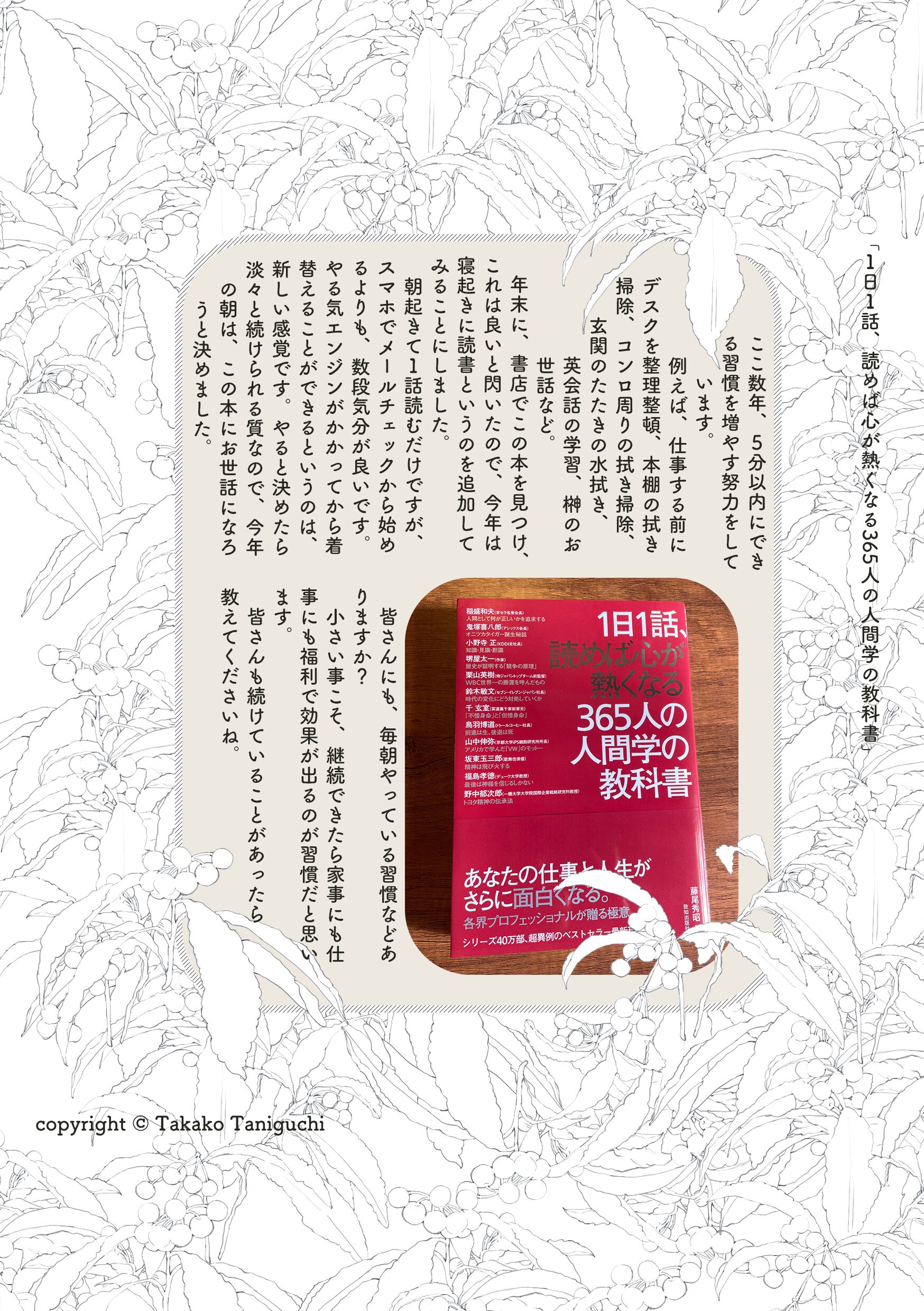 朝起きて、1話読むだけですが、スマホでメールチェックから始めるよりも、数段気分がよいですね。やる気エンジンがかかってから着替えることができるというのは、新しい感覚です。やると決めたら淡々と続けられる質なので、今年の朝は、この本にお世話になろうと決めました。