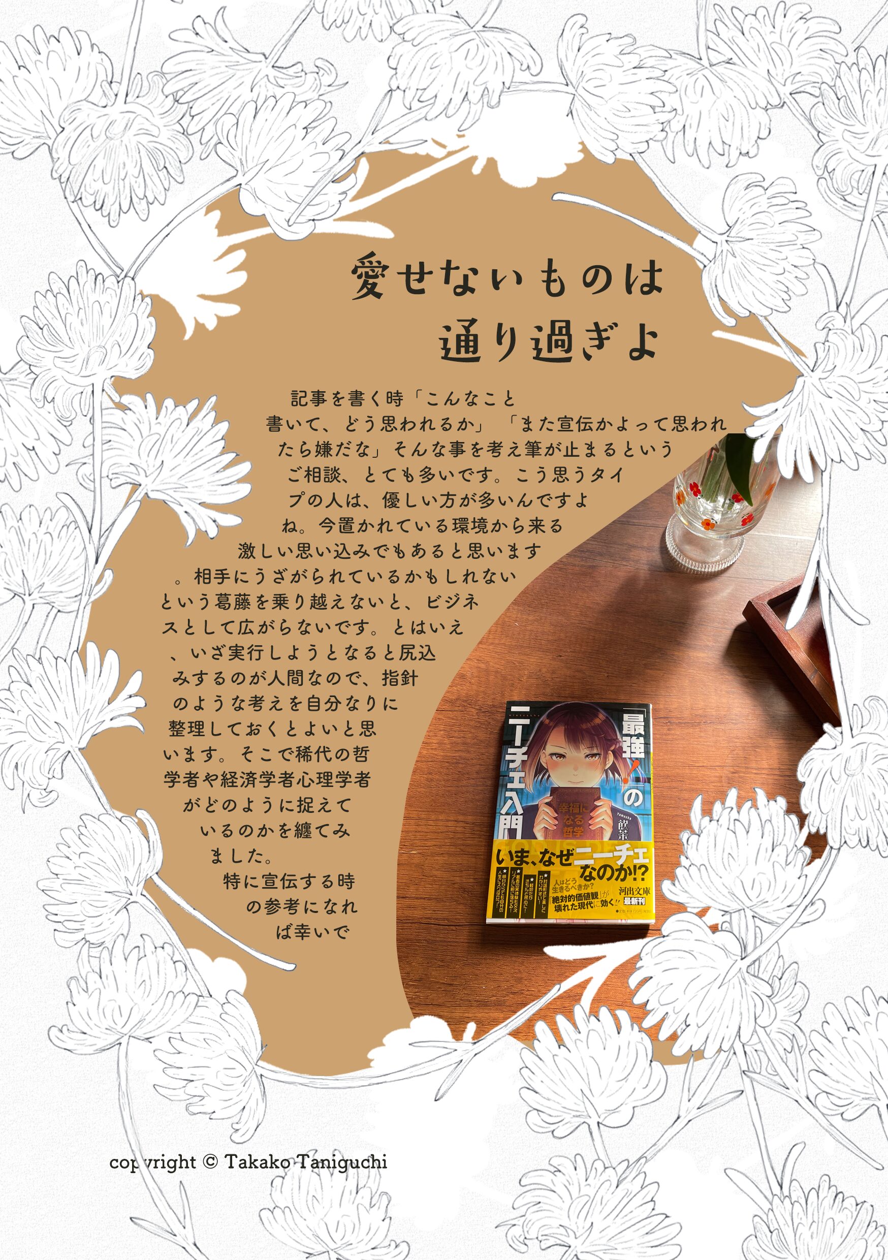 宣伝の文句、タイミング、誠実さ、発信すること自体は自分でコントロールが出来るものの、それによる他人からの評判や、その人の機嫌、反応の結果や、売上などは完璧にコントロールするって難しいですよね。コントロール不能なものに責任を感じる必要は無いよという事ですね。