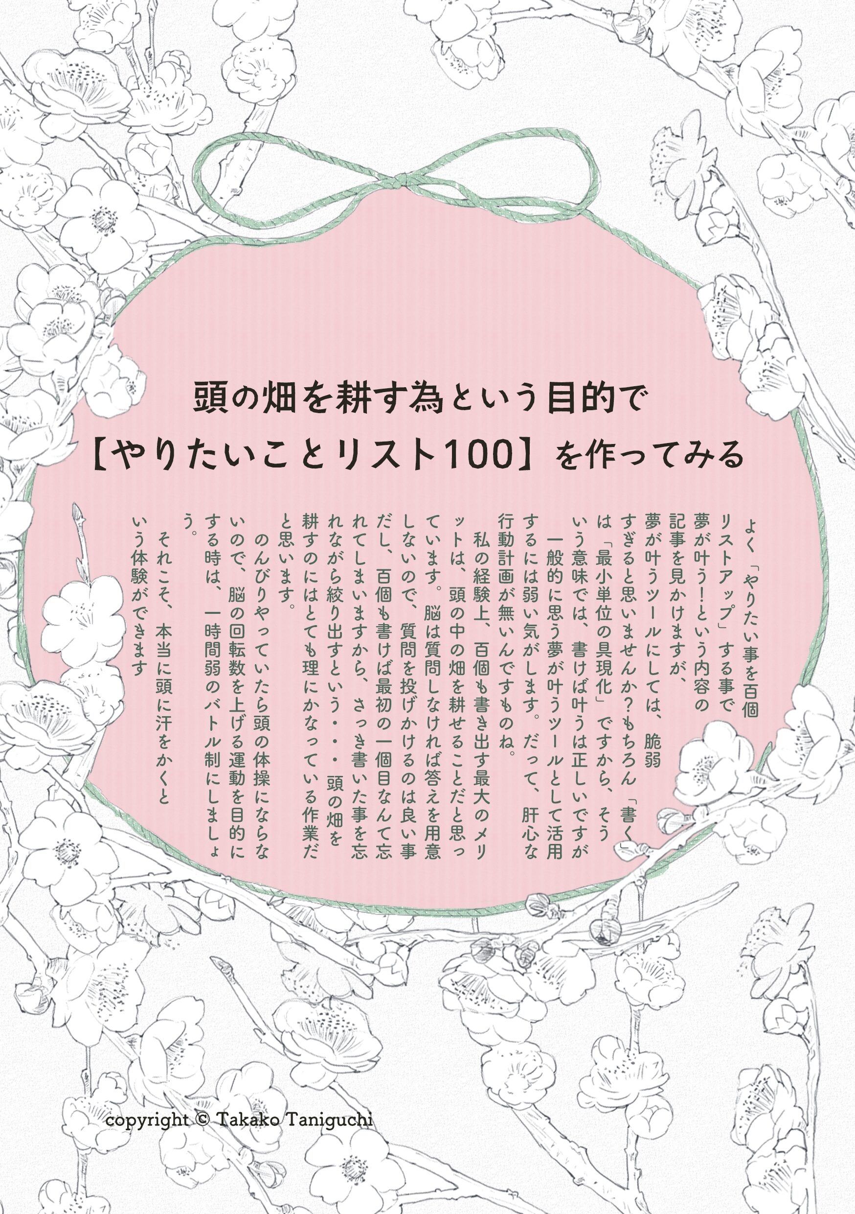 私の経験上、100個も書き出す最大のメリットは、頭の中の畑を耕せることだと思っています。